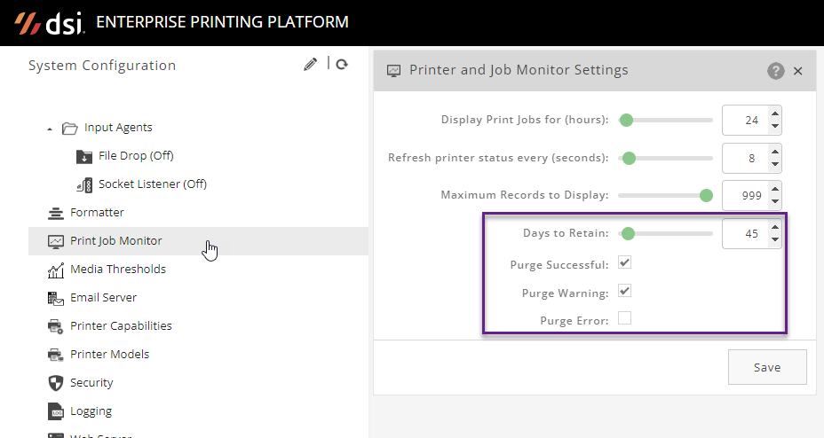 In EPP 10.0.1.0 and later, an enhancement was added to be able to configure automatic purging of print records by ‘days to retain’ and selecting which job statuses are purged.