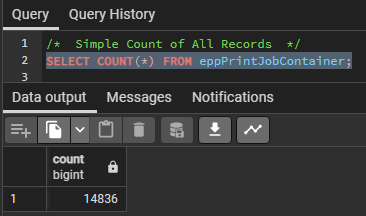 Getting an initial record count of the eppPrintJobContainer can help determine if the EPP 10 print history needs to be cleaned up a bit. Below query example will count the number of records in the entire eppPrintJobContainer table.