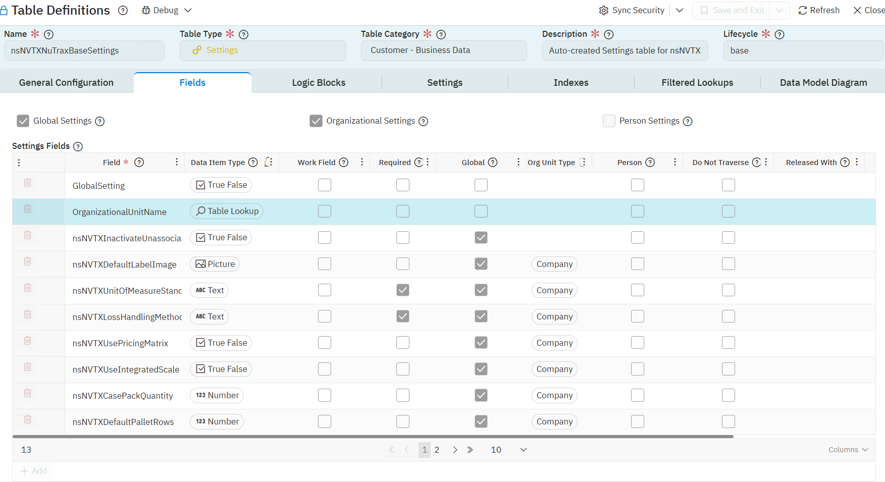 OrganizationalUnitName_Name data item—Add on the header row to create the Organizational Unit fields in the Module Setting application. This is how you configure the module settings to be on an organization level, and select the organization.