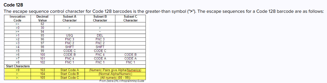 - ASCII characters 32 to 127 (0–9, A–Z, a–z), special characters, and FNC 1–4
